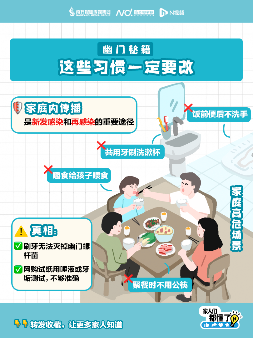 口臭是让人社交尴尬的事,如刷牙漱口都没用淘配网,就要警惕是否幽门螺杆菌的“杰作”。它在胃内产生氨及挥发性硫化物,通过反流进入口腔,引发臭味。有这几个症状要警惕 ✅不少人感染后无症状:无症状不代表不需要治疗➡️顽固性口臭,刷牙也没用➡️腹胀、腹痛、恶心、呕吐➡️反酸、消化不良、变瘦这些习惯一定要改️家庭内传播是新发感染和再感染的重要途径❎ 聚餐时不用公筷❎ 嚼食给孩子喂食❎ 共用牙刷洗漱杯❎ 饭前便后不洗手⚠真相:✅ 刷牙无法灭掉幽门螺杆菌✅ 网购试纸用唾液或牙垢测试,不够准确