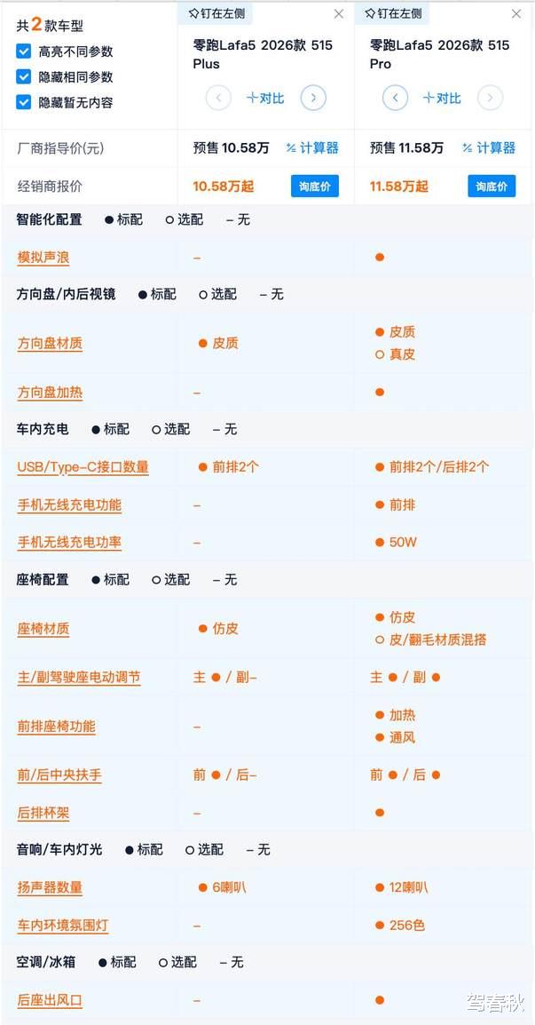 除此之外,Pro版还多出了前后头部气囊、电动后备箱、全景天窗、外后视镜调节、折叠、座椅加热/通风、前排50W手机无线充蒂娜、方向盘加热、后排中央扶手、后排杯架、后排出风口等,再来看差价,515 Plus版预售价10.58万,515Pro预售价11.58万,只相差1万元,这样来看Pro版显然更加合适。